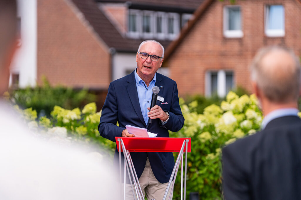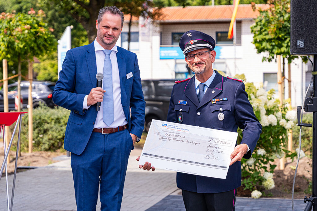 Geladene Gäste waren unter anderem Vorstand und Vertreter der Volksbank eG Bad Laer-Borgloh-Hilter-Melle sowie der Bürgermeister von Isernhagen, Tim Mithöfer und Michael Frerking, Leiter Amt für Wirtschaft und Finanzen der Gemeinde Isernhagen. Ebenfalls anwesend waren der Architekt Andreas Hecht von Hannover Haus sowie alle Gewerke, die am Bau tätig waren und die Mitarbeitenden der Verwaltung, Freunde und Familie. Im Rahmen der Feierlichkeiten überreichte Kai Brand einen Spendenscheck in Höhe von 1.000 Euro an die Freiwillige Feuerwehr Isernhagen, Ortsteil Altwarmbüchen.